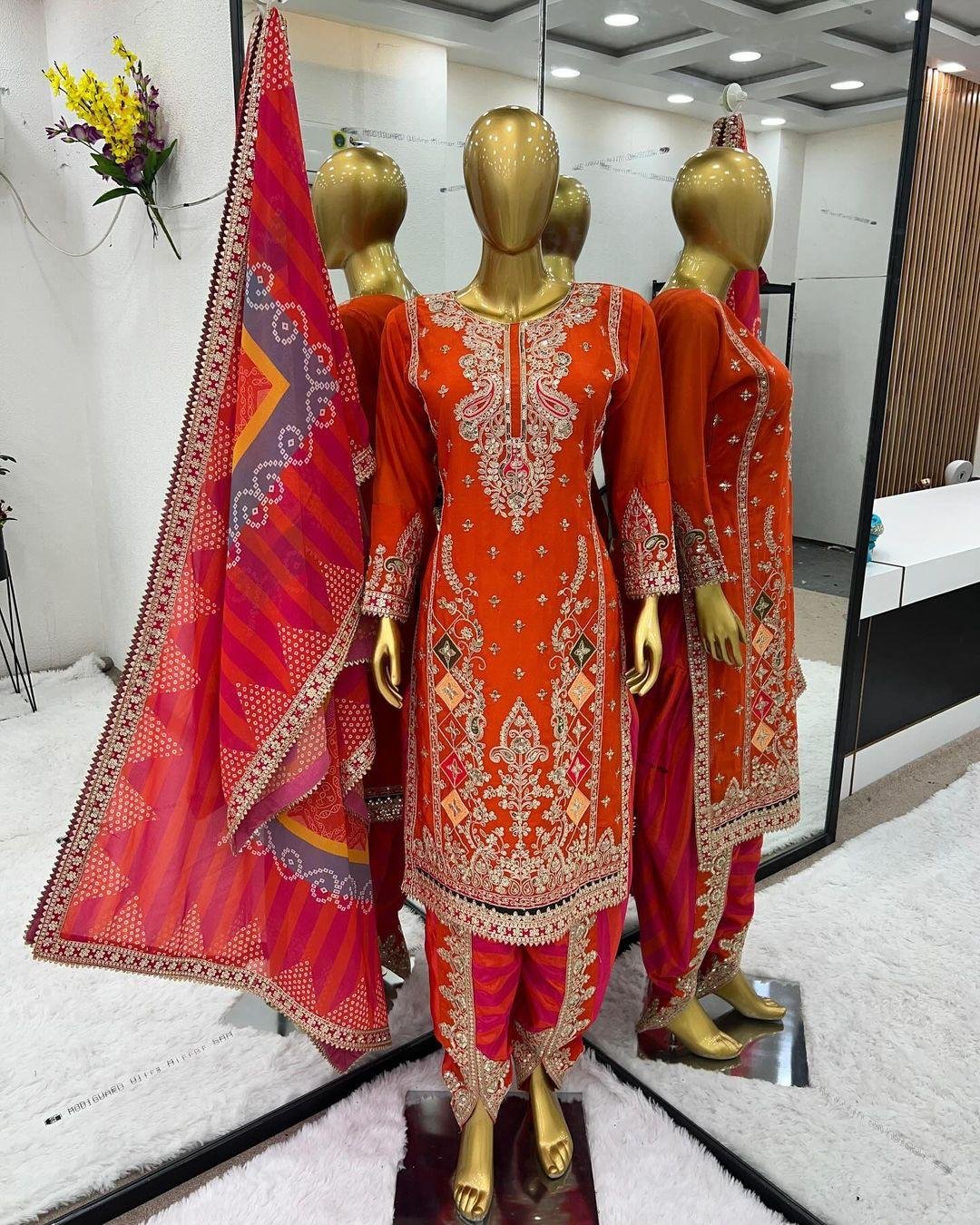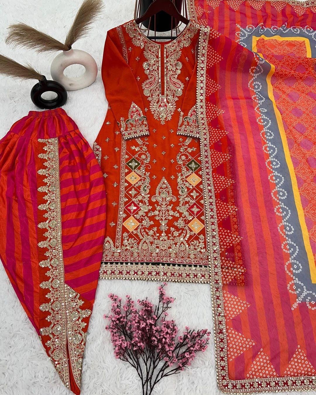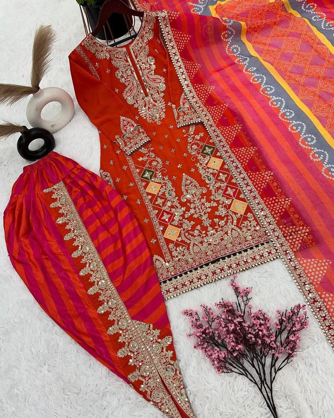 The combination of the tulip-style pant and the bandani-style dupatta adds a touch of contemporary chic to the traditional aesthetic. The tulip pant, cut with precision, brings versatility to your wardrobe, making it ideal for both formal gatherings and casual outings. The bandani-style dupatta, with its classic patterns and rich fabric, enhances the suit’s appeal, creating a harmonious blend of tradition and modern design.