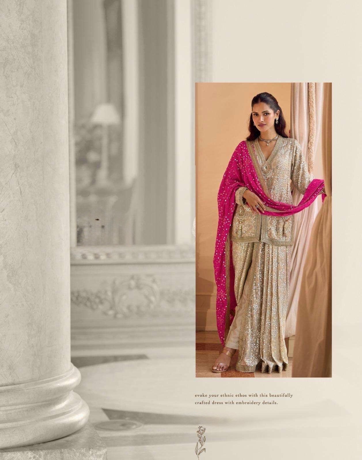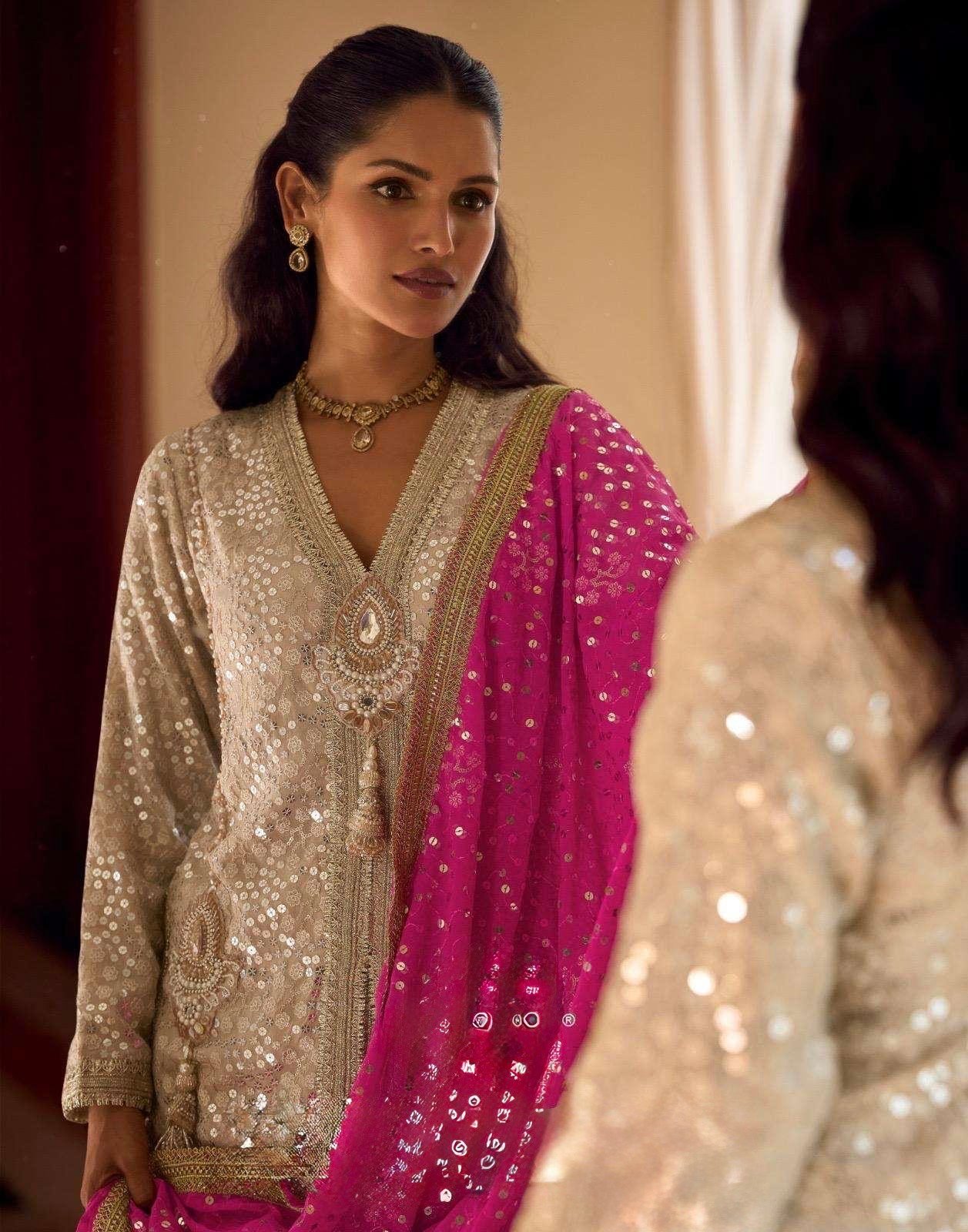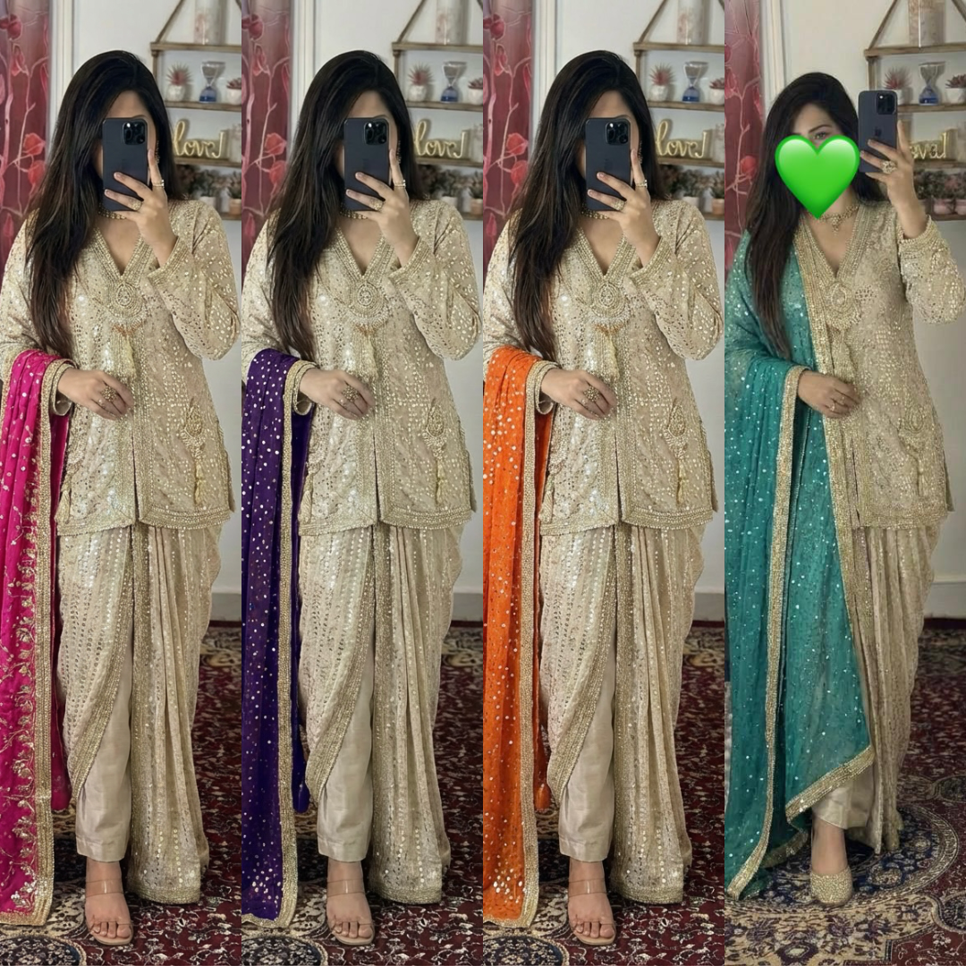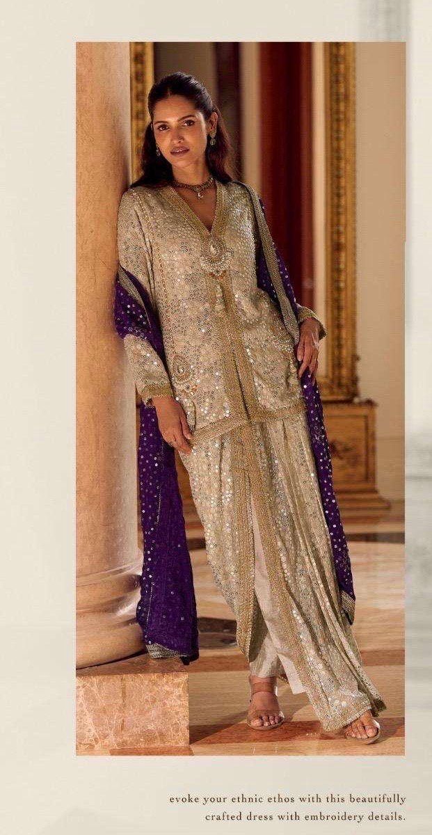 Absolutely stunning premium Partywear dress in indowestern style with jewellery piece on shirt and contrast duppata