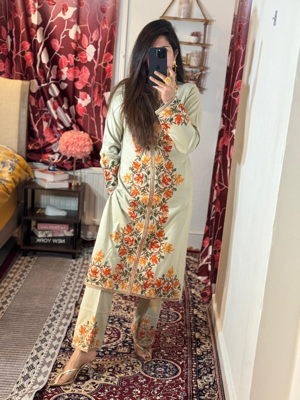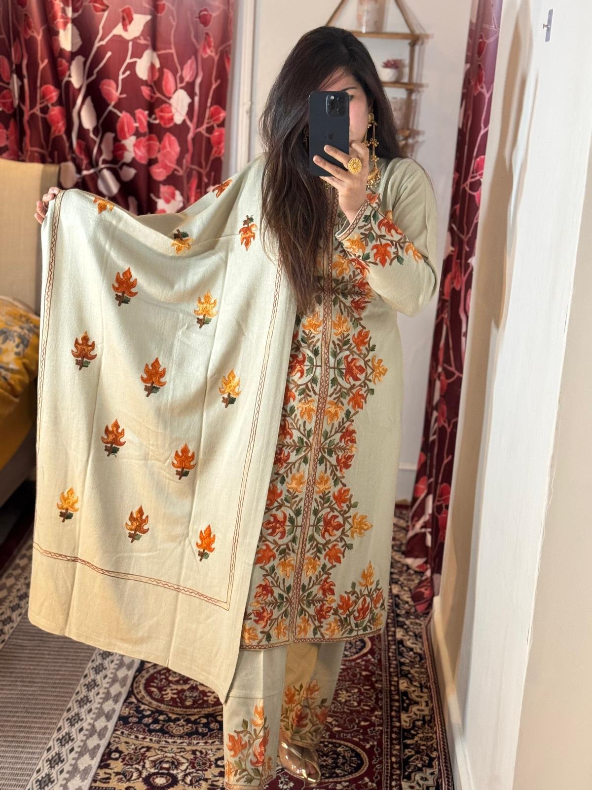 The stunning embroidery detailing on this three-piece set adds an artistic flourish that makes it a statement piece. The intricate patterns are inspired by traditional Kashmiri motifs, blending cultural richness with modern design sensibilities. Pair it effortlessly with your favorite accessories and let the set transform any ensemble into a masterpiece of refined elegance. It’s an investment in timeless beauty, perfect for anyone looking to elevate their wardrobe with authentic craftsmanship and luxurious style.