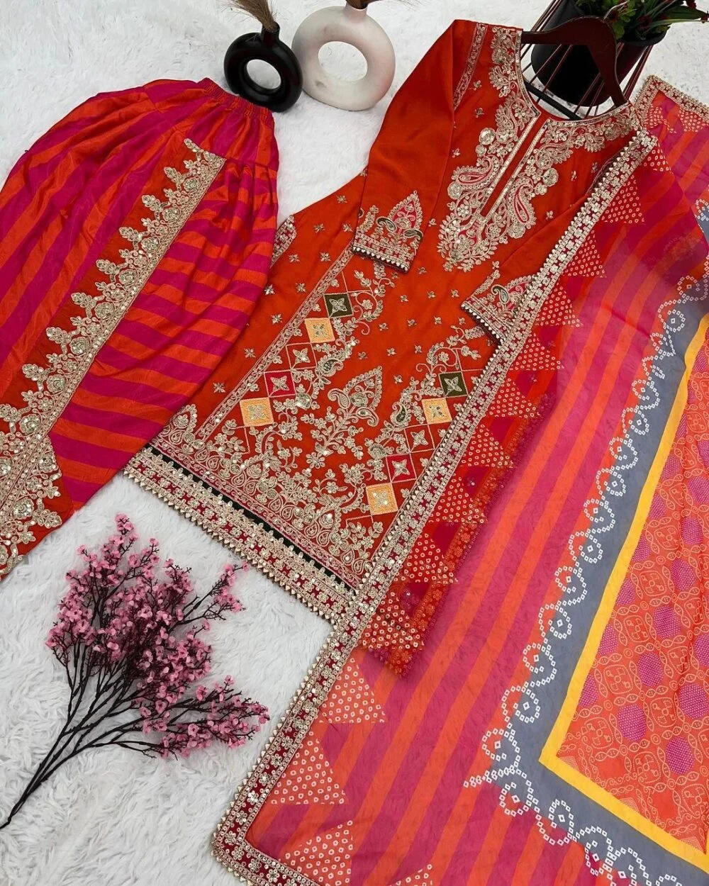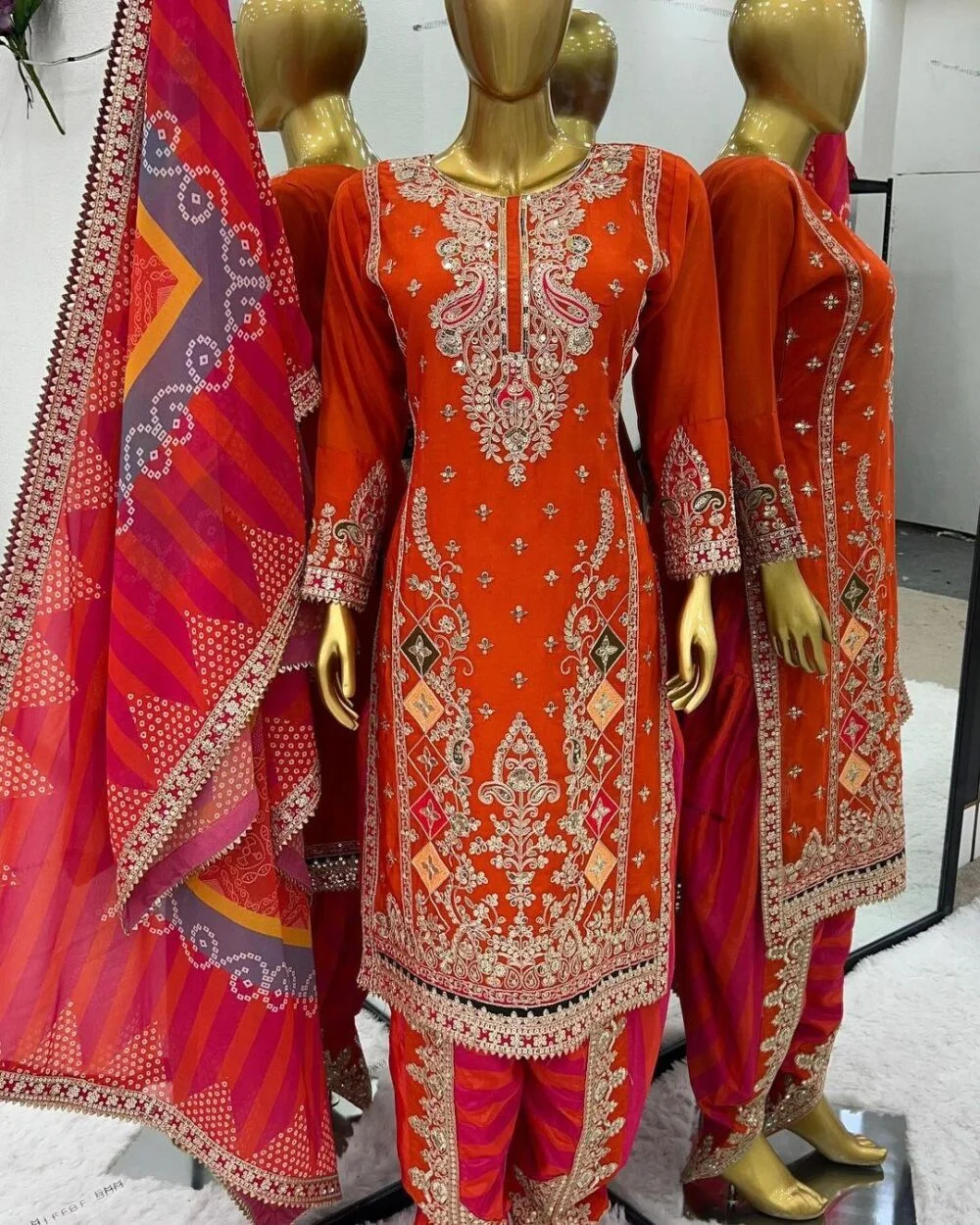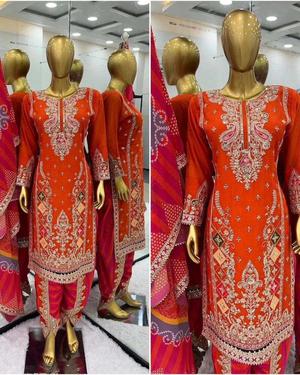 The combination of the tulip-style pant and the bandani-style dupatta adds a touch of contemporary chic to the traditional aesthetic. The tulip pant, cut with precision, brings versatility to your wardrobe, making it ideal for both formal gatherings and casual outings. The bandani-style dupatta, with its classic patterns and rich fabric, enhances the suit’s appeal, creating a harmonious blend of tradition and modern design.