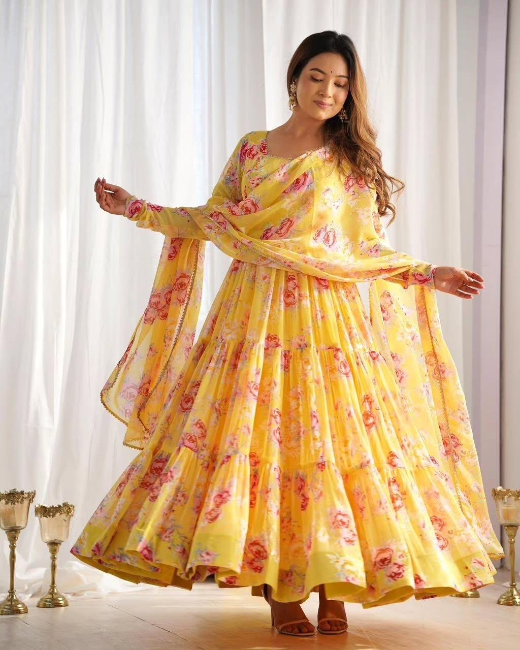 The heavy flared floral Anarkali is designed with craftsmanship that lasts. High-quality fabric and materials ensure durability and comfort, while floral detailing adds a timeless touch. The three-piece set promises versatility, as you can mix and match the elements to curate your ideal outfit. Treat yourself or a loved one to a wardrobe staple that blends tradition and contemporary style seamlessly.yeyÿ