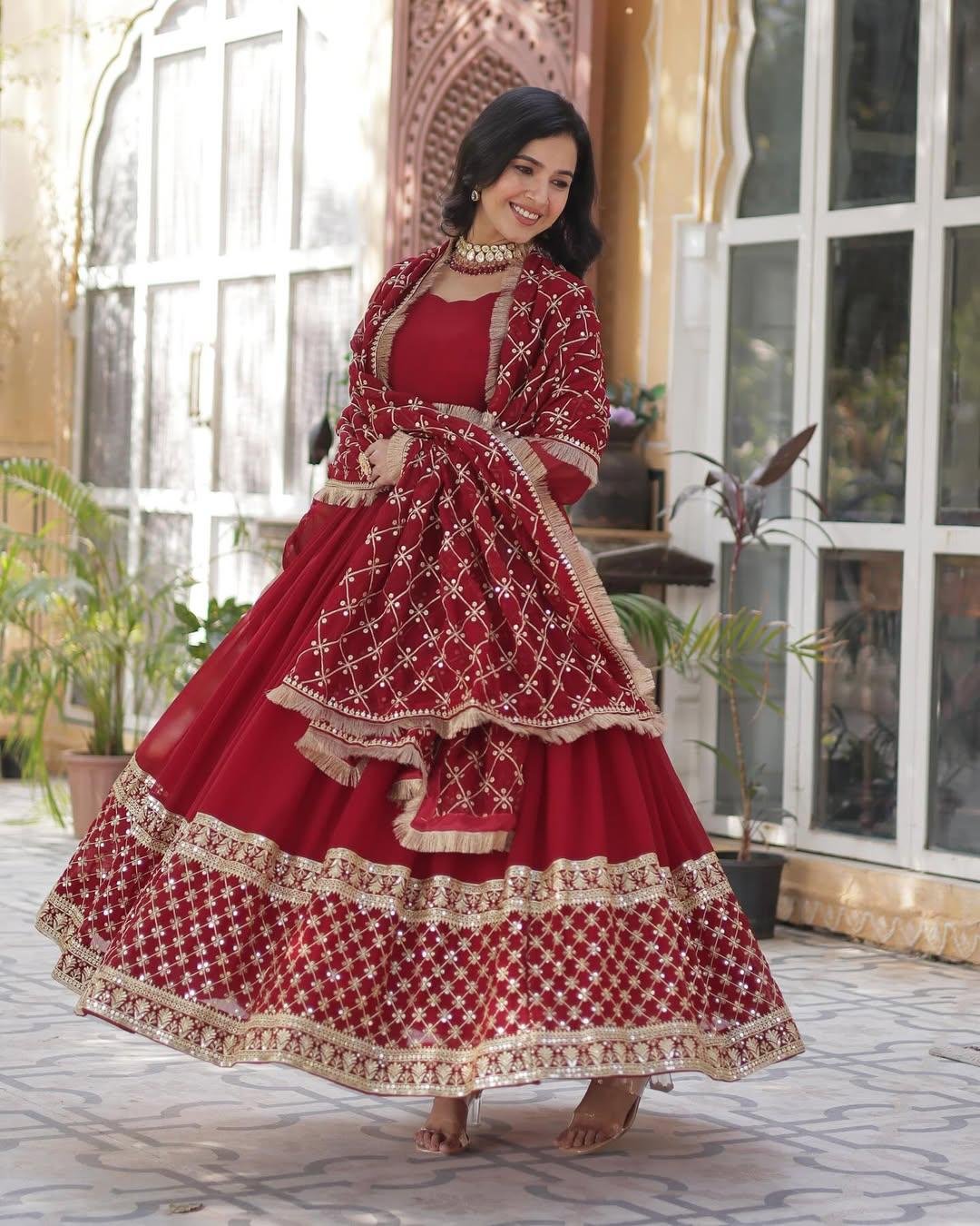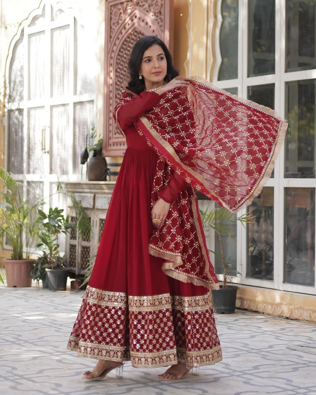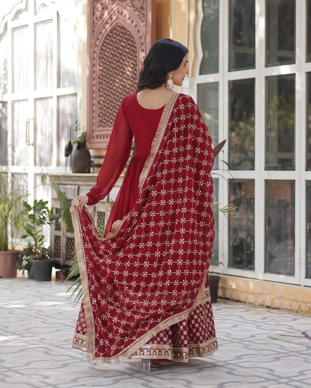 The accompanying dupatta is a work of art in itself. Its intricate detailing and luxurious feel complement the Anarkali seamlessly. Draped across your shoulders or styled as you wish, the dupatta adds an ethereal touch to your entire outfit. This combination of Anarkali and dupatta is thoughtfully curated to balance charm with versatility, making it suitable for countless occasions.