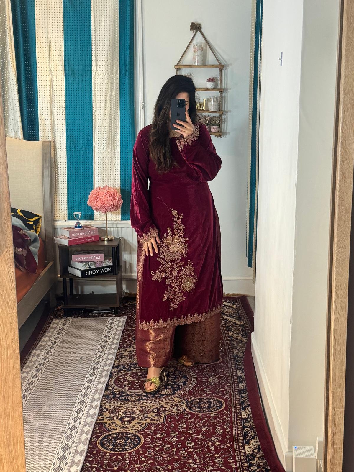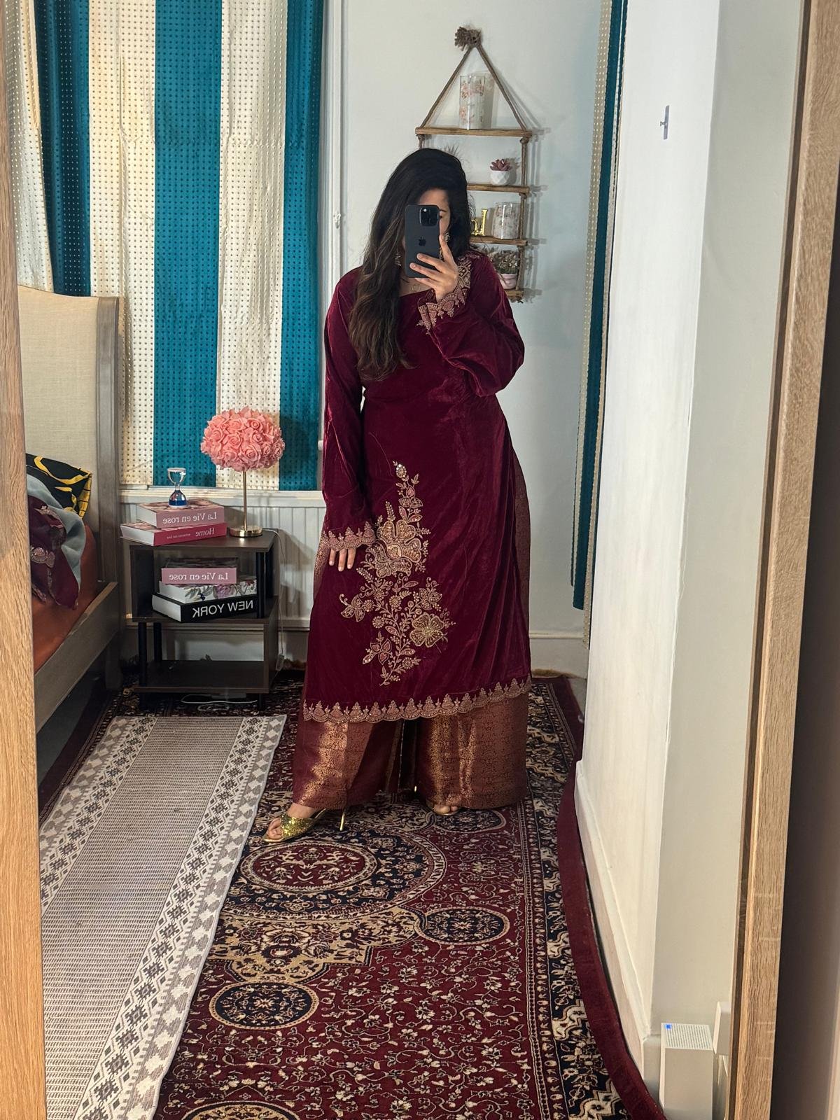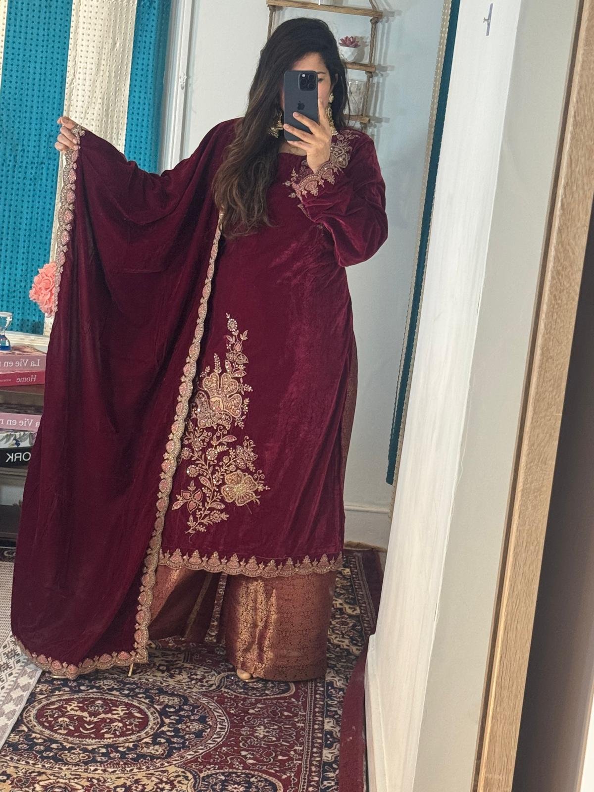 Whether you’re attending an evening wedding reception, celebrating festive moments, or making a statement at an elite gathering, this beautiful velvet suit with Zara coding embroidery paired with elephant brocade trousers and a velvet shawl is your ultimate style companion. Its luxurious details ensure you remain the center of attention while staying effortlessly comfortable.