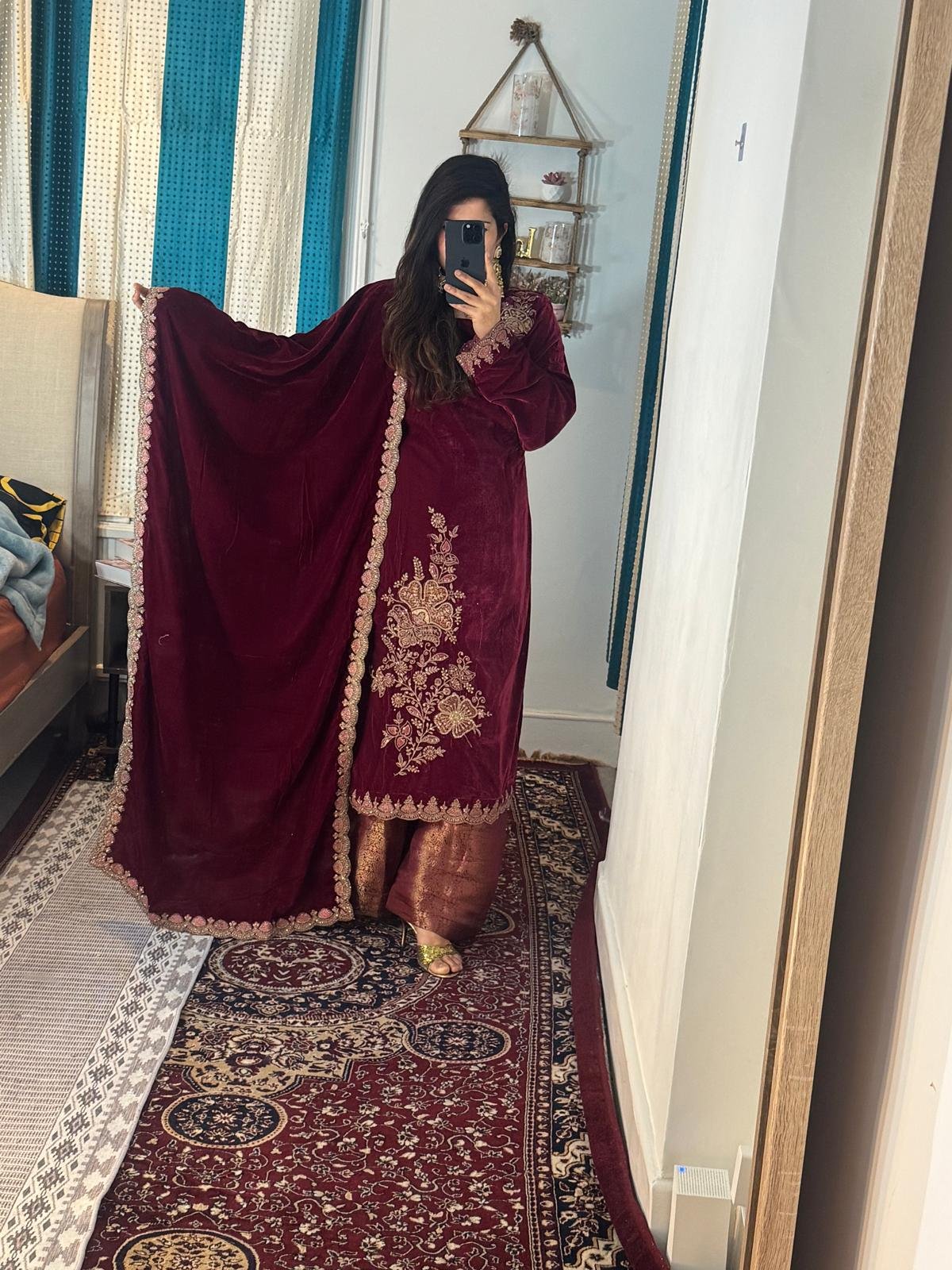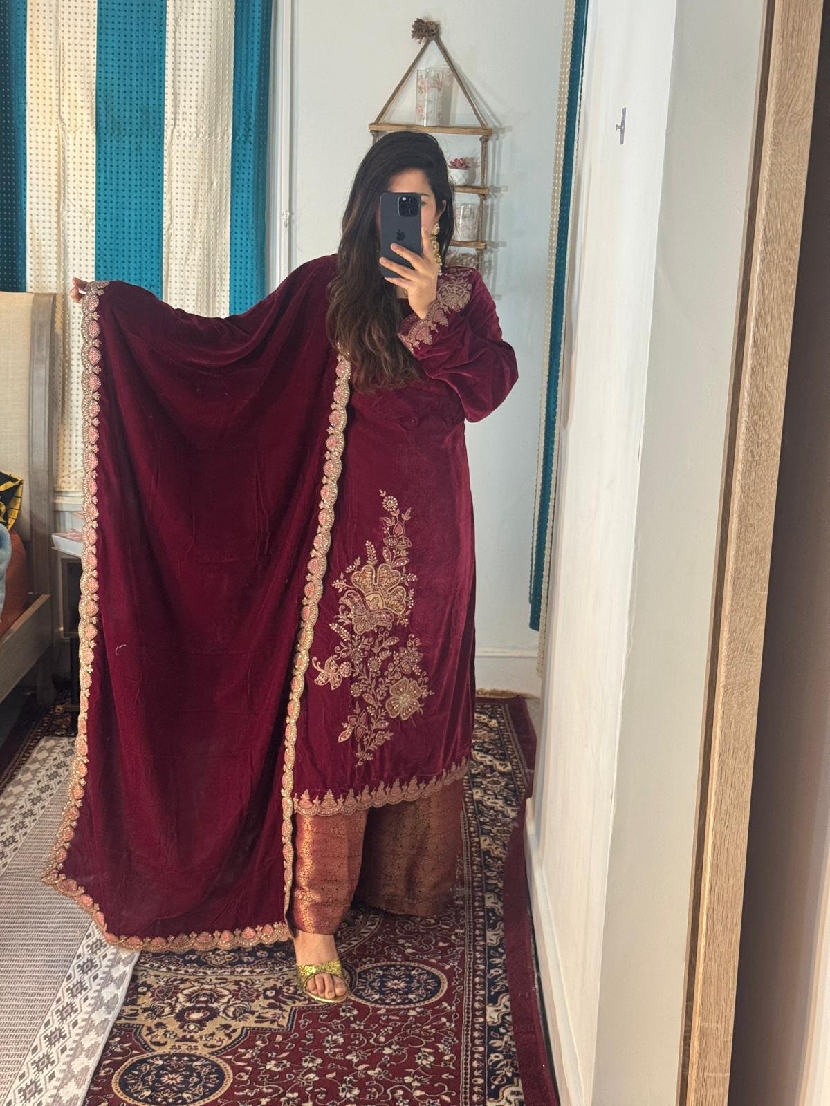 No outfit is complete without the perfect finishing touch. Complementing this ensemble is an alluring velvet shawl, adding layers of sophistication and grace to the overall look. Drape it elegantly, and embrace the royal vibe that this outfit promises to deliver.