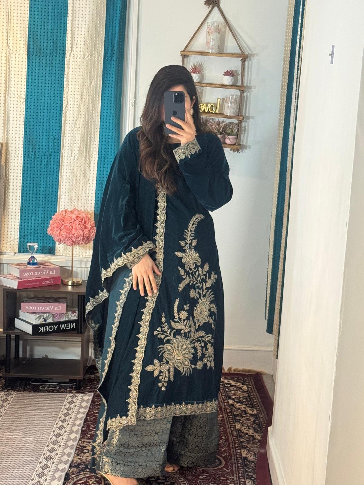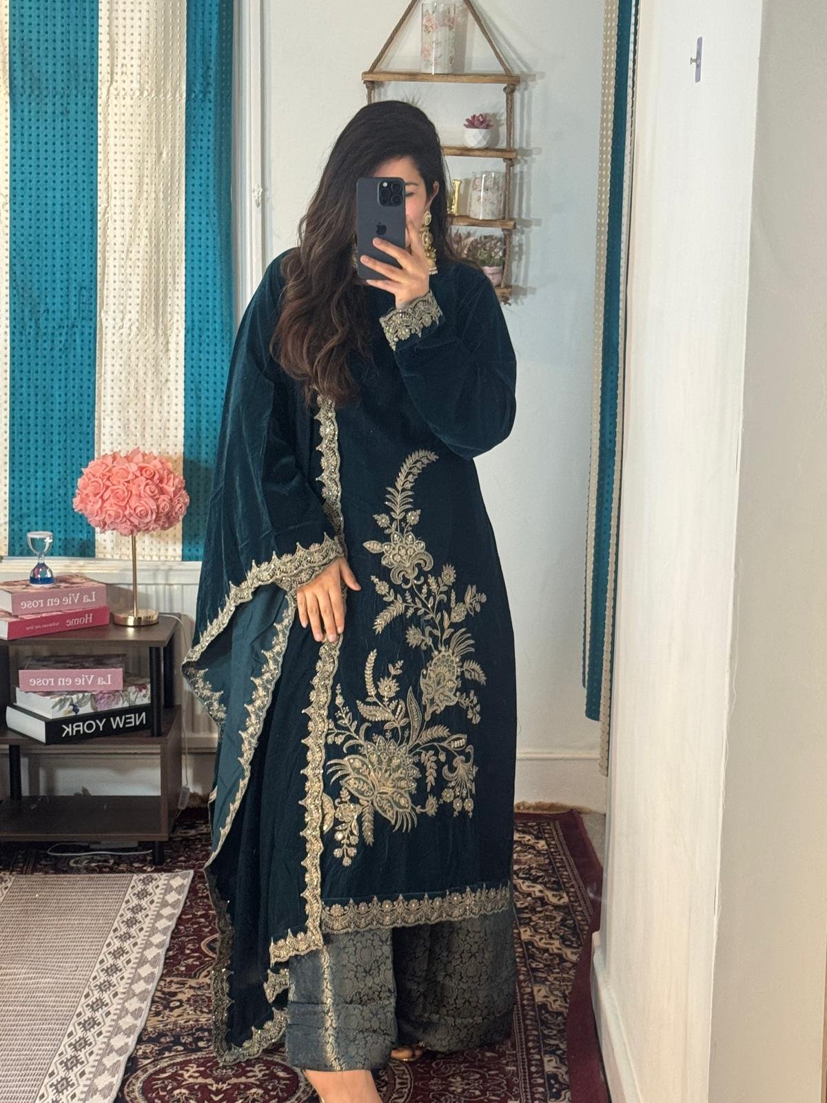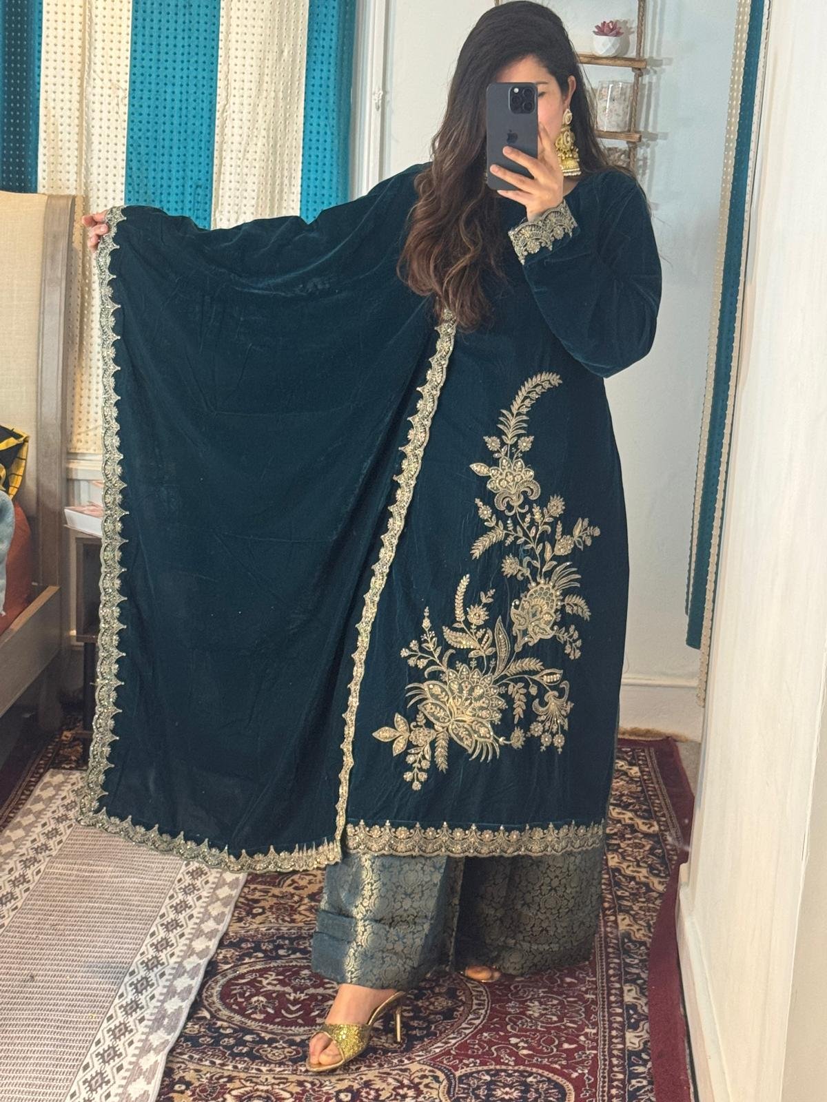 If timeless elegance is what you seek, this velvet suit set is exactly what your wardrobe needs. Combining sophistication with style, this outfit is designed to dazzle with its intricate zari embroidery and luxurious textures. Perfect for festive occasions, weddings, or grand celebrations, this outfit epitomizes grace and charm.