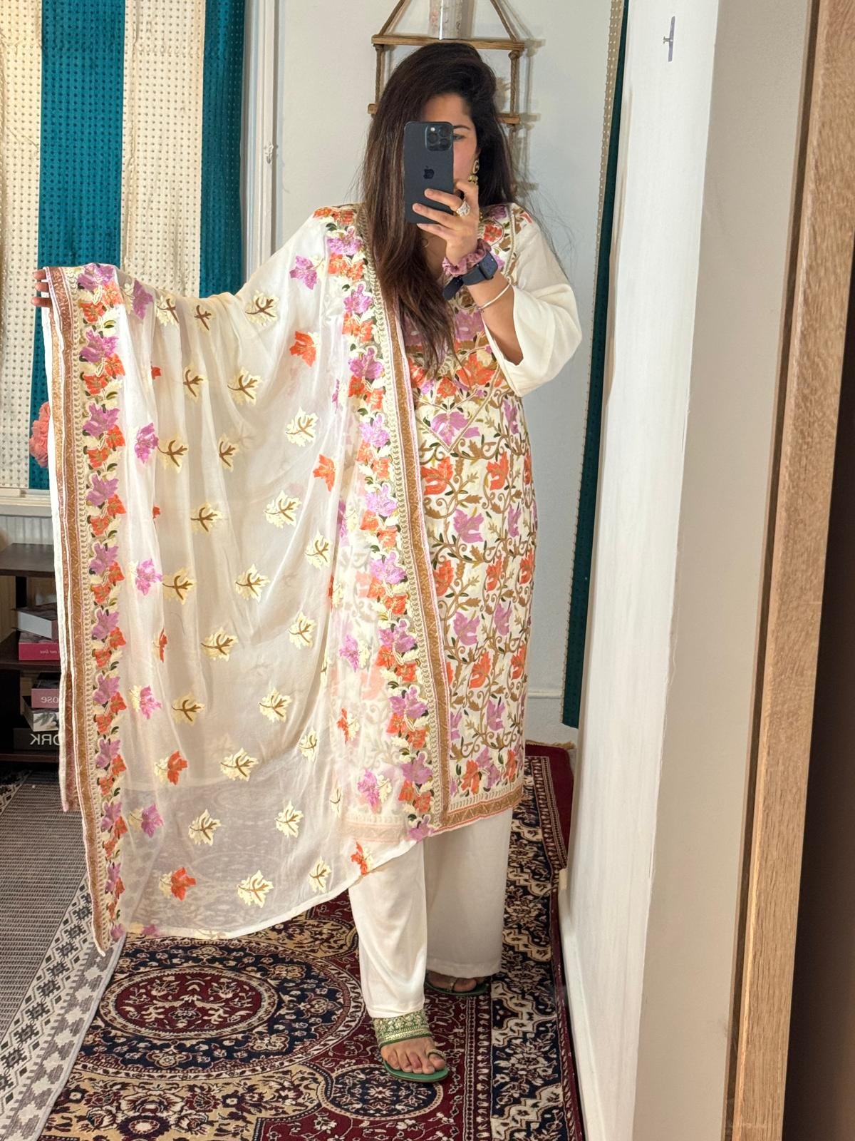 Enhance your wardrobe with our stunning Kashmiri fully embroidered work suit made from premium rayon fabric, paired with an exquisitely embroidered chiffon dupatta. This suit is a perfect blend of comfort and style, making it ideal for both casual outings and festive celebrations. The rich embroidery work reflects the traditional Kashmiri craftsmanship, highlighting intricate designs that add a sophisticated flair to your look.