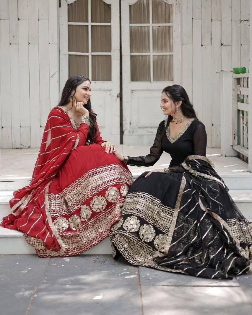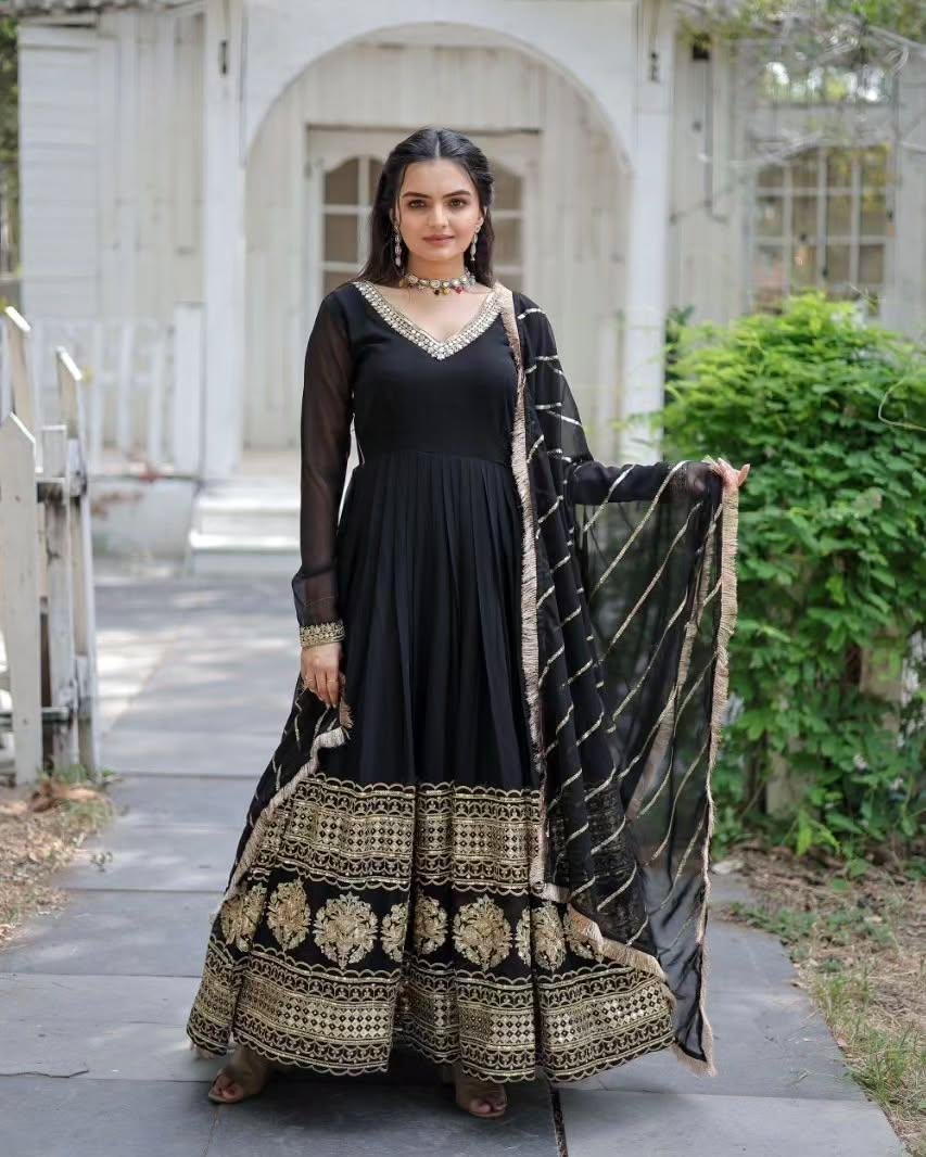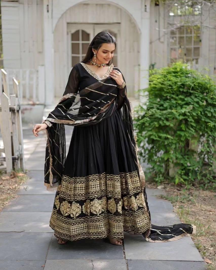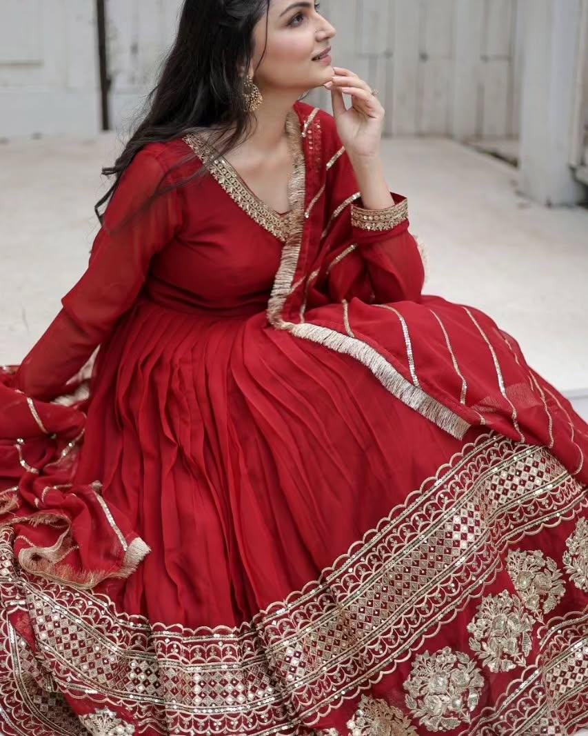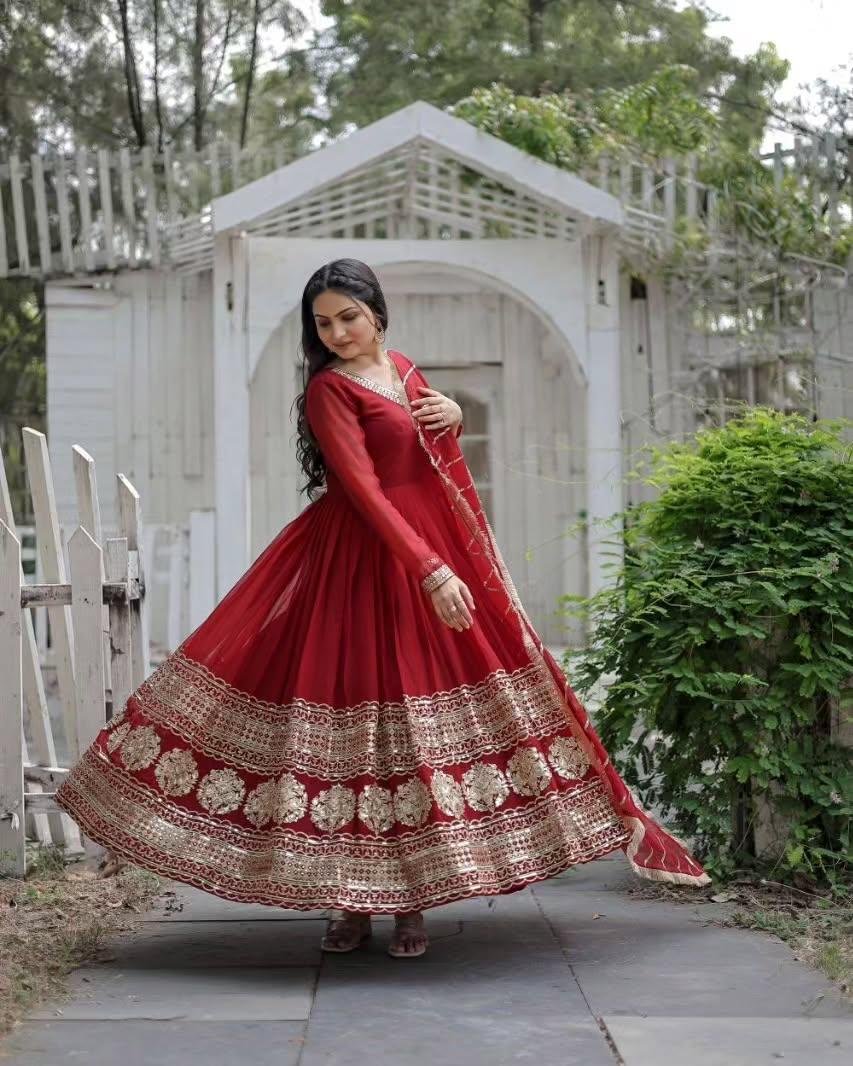 The defining feature of this Anarkali dress is its intricately designed heavy border at the flare. The craftsmanship reflects traditional artistry with a modern twist, offering a luxurious appeal that speaks of quality and style. The flowing silhouette not only accentuates your grace but also ensures unmatched comfort, making it an ideal outfit for long hours of celebration. The border, adorned with fine embroidery or embellishments, provid0es the perfect touch of opulence.