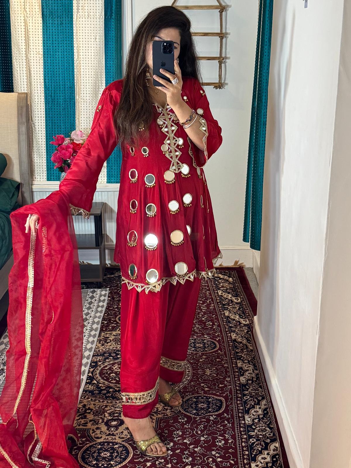 The highlight of this design lies in the intricate stitched real mirror accents and gungru bead detailing. These elements not only add a touch of glamour but also showcase the rich tradition of handcrafted artistry. The beautiful neckline further enhances the look, making this outfit a versatile addition to any fashion-forward collection.