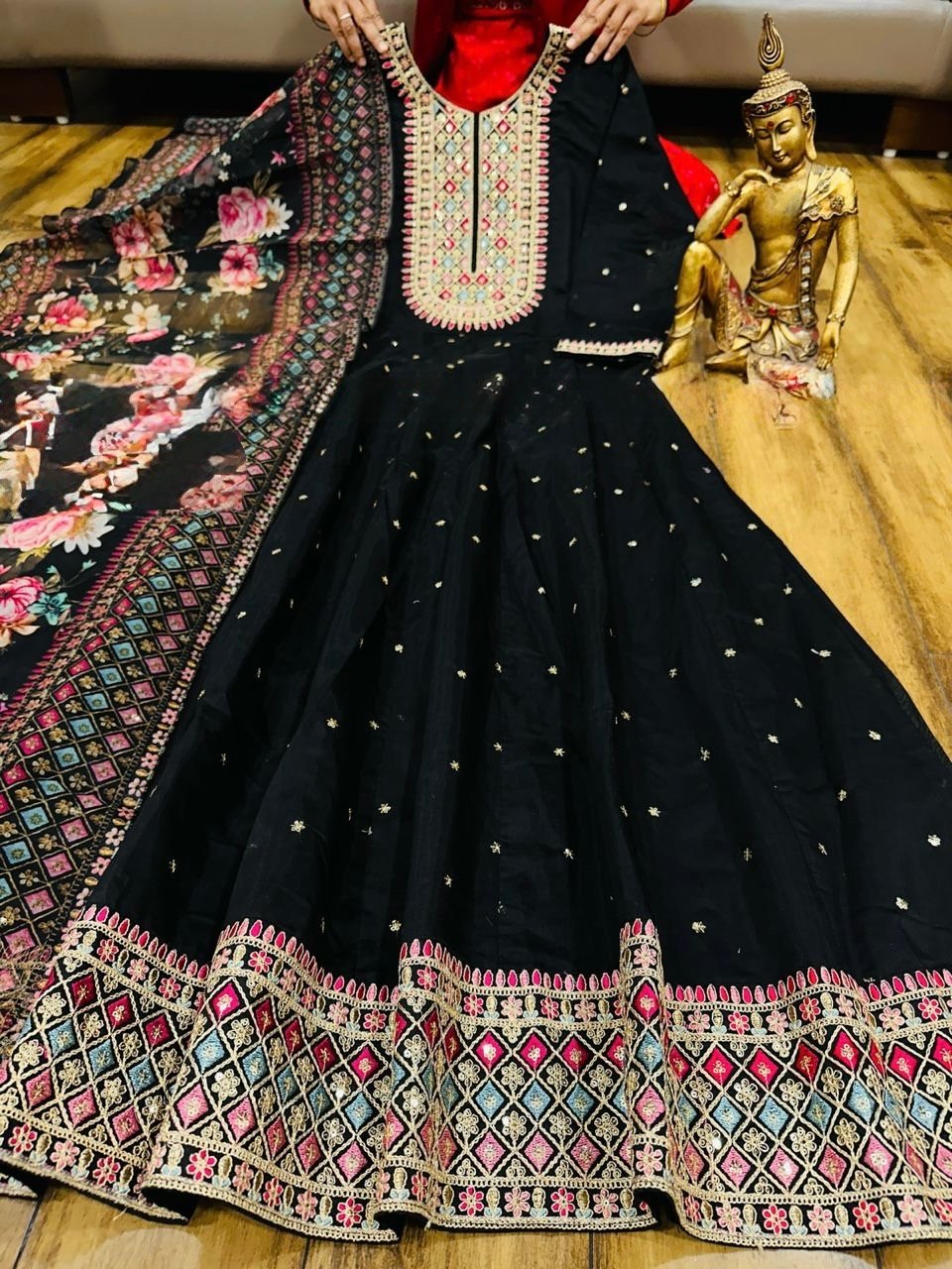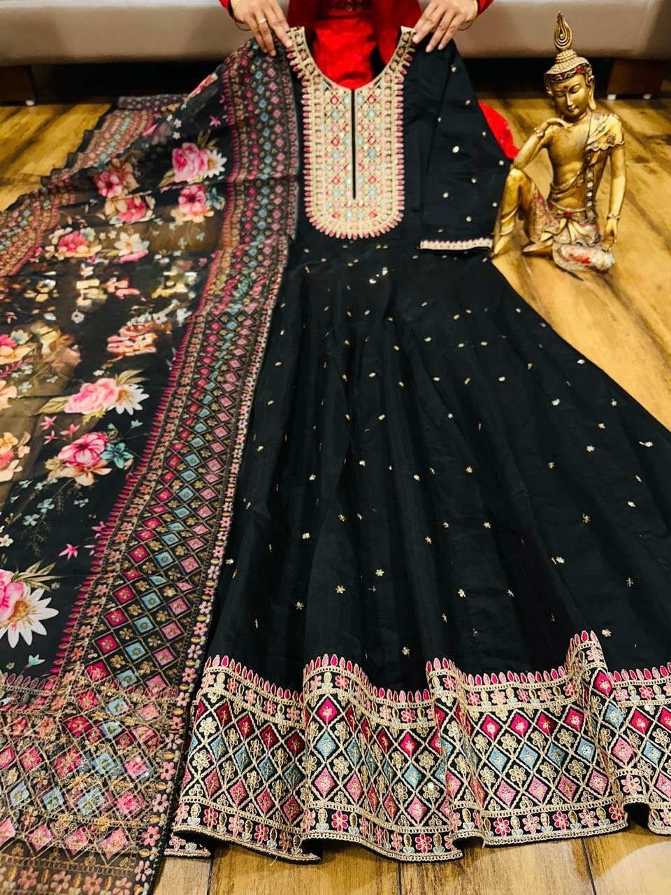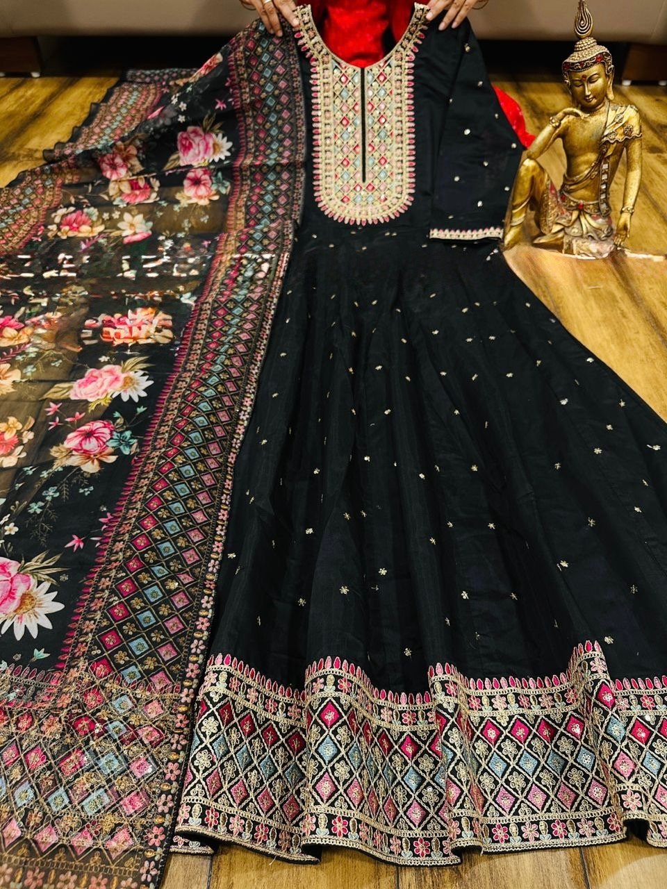 2 piece Anarkali with detailing on neckline and Hem paired up with floral dupatta