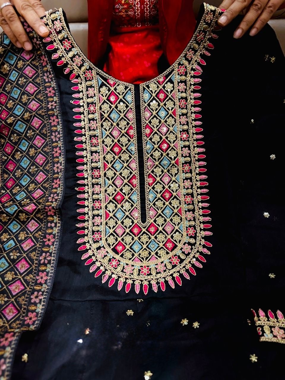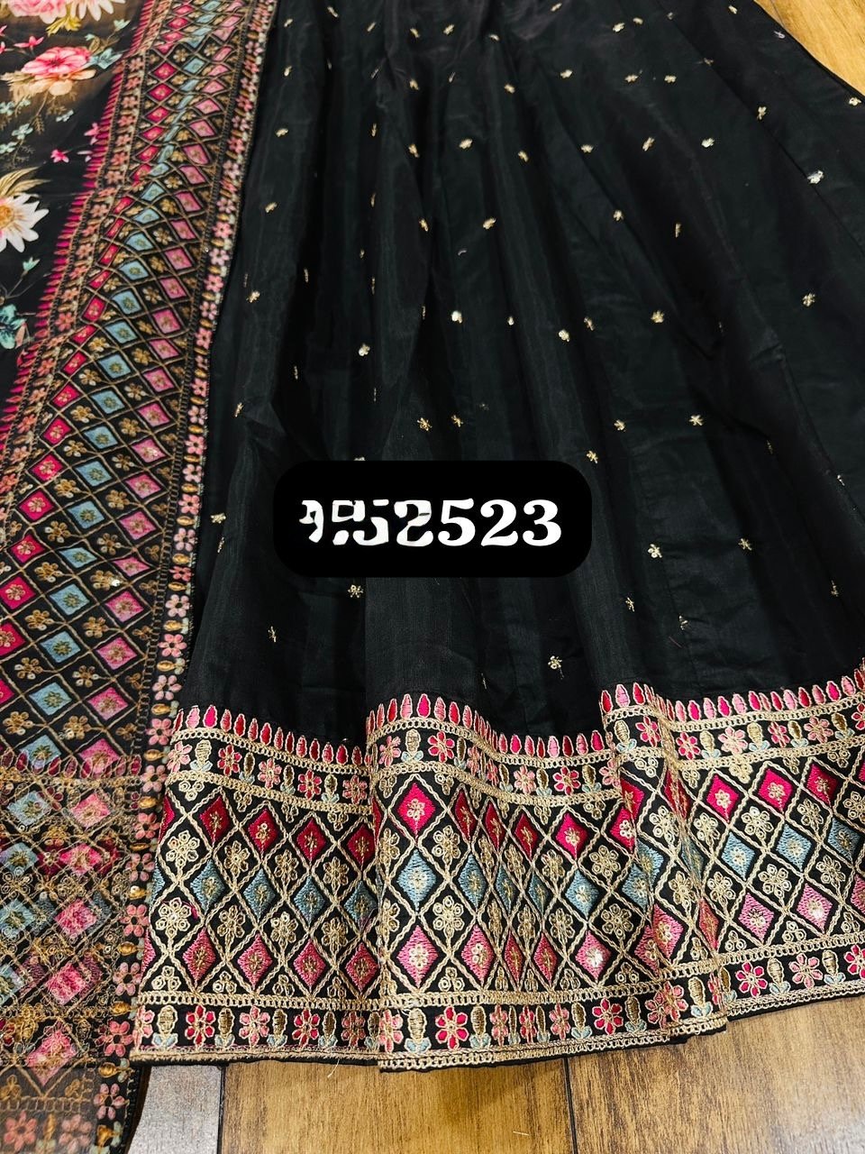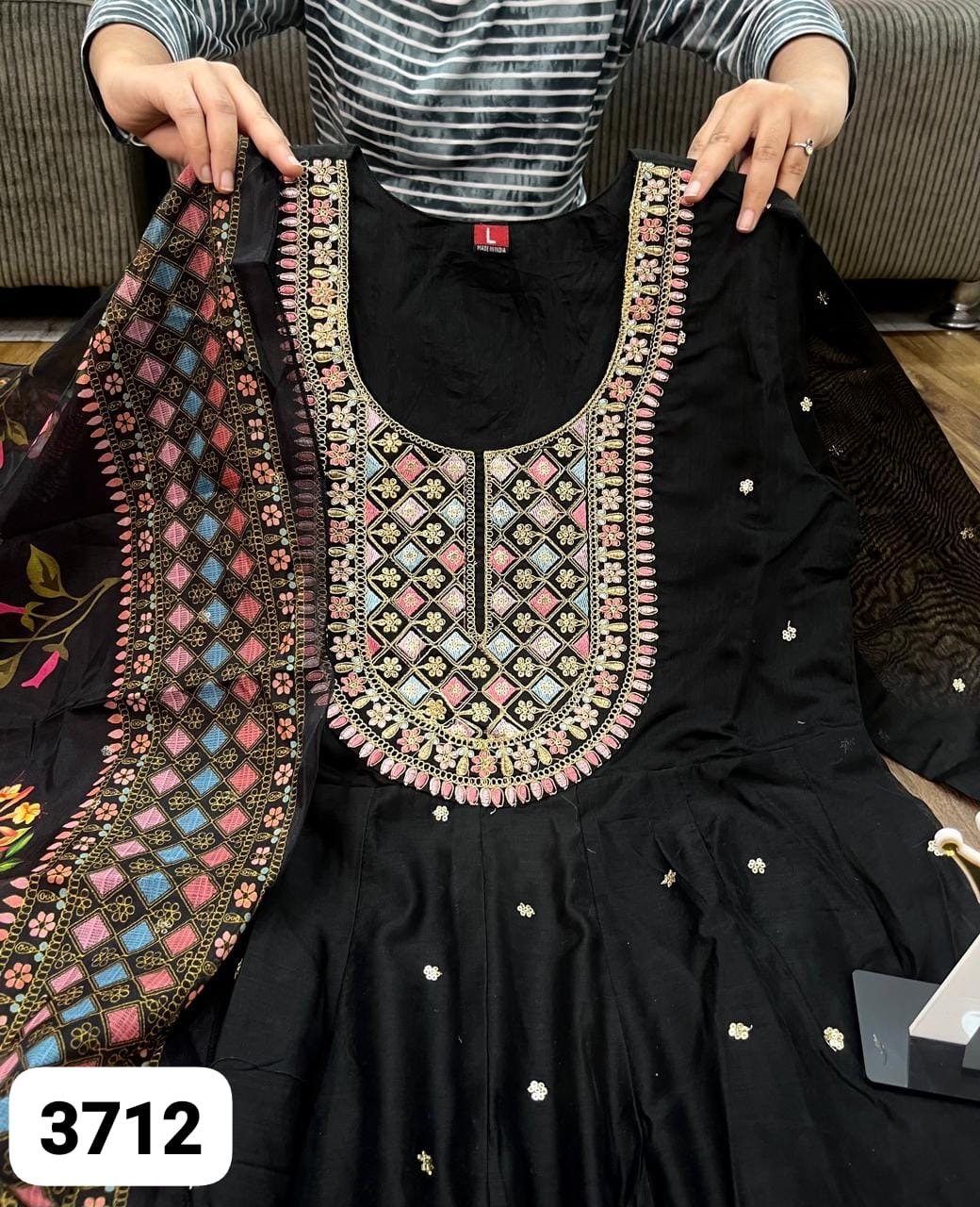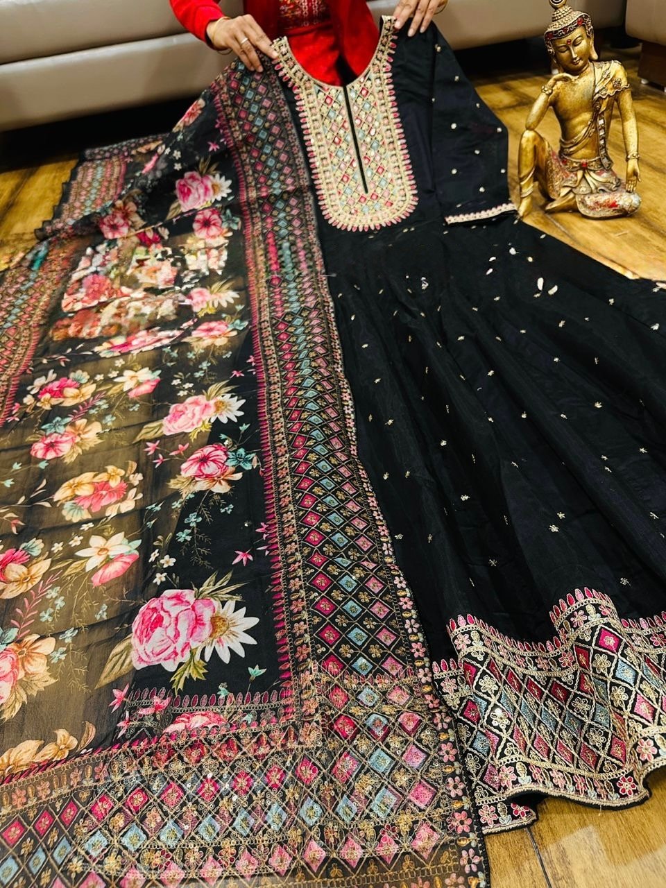 2 piece Anarkali with detailing on neckline and Hem paired up with floral dupatta