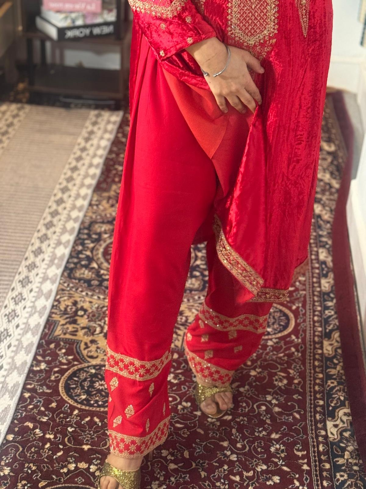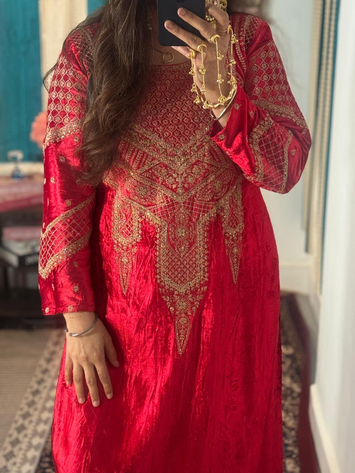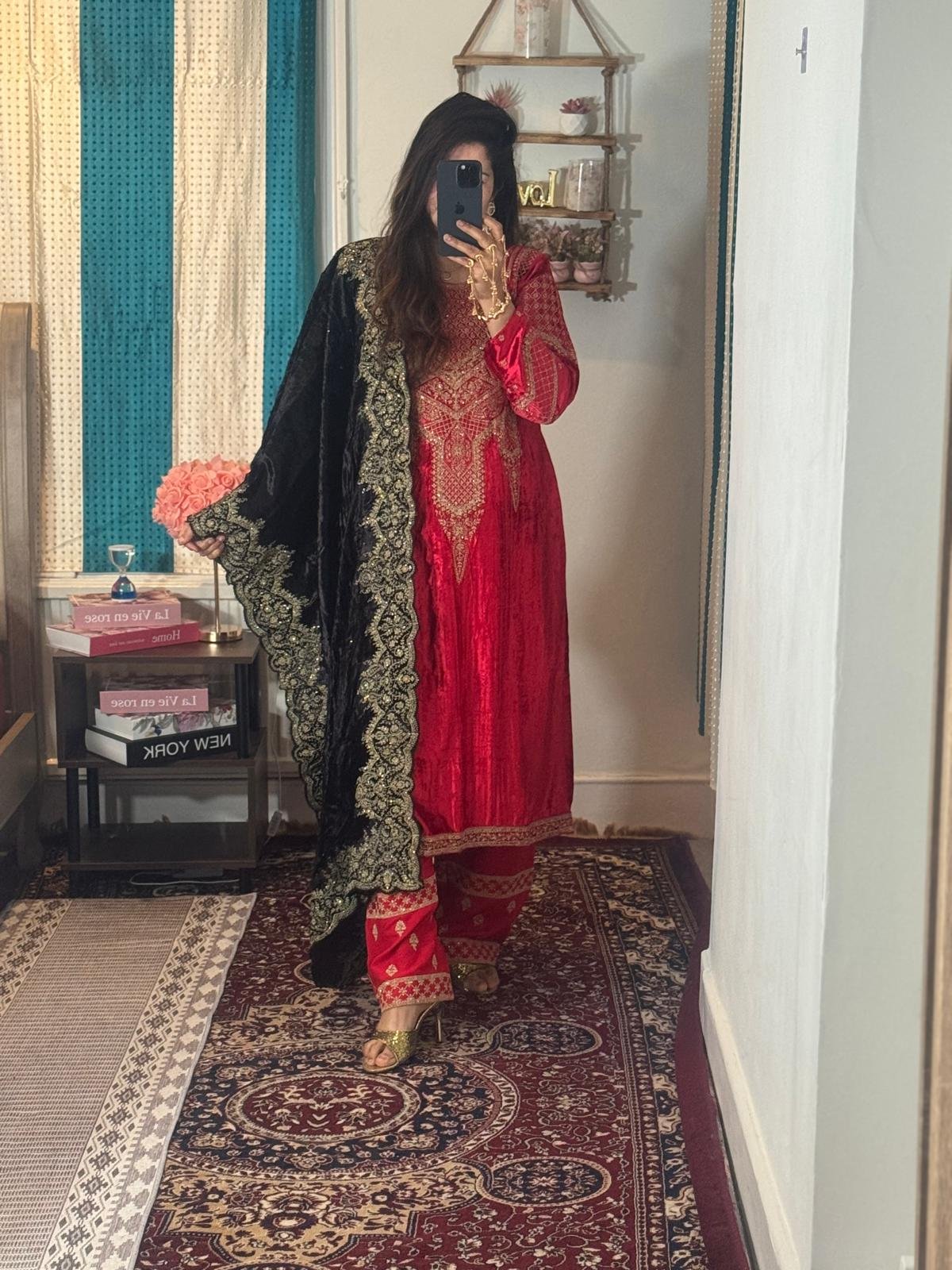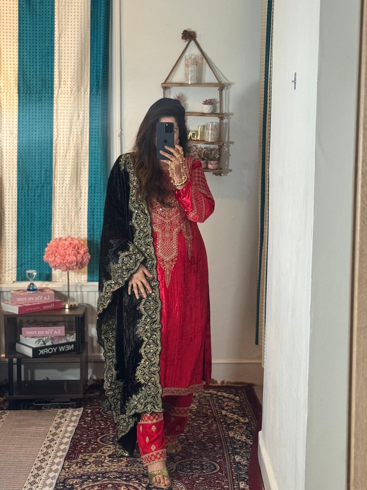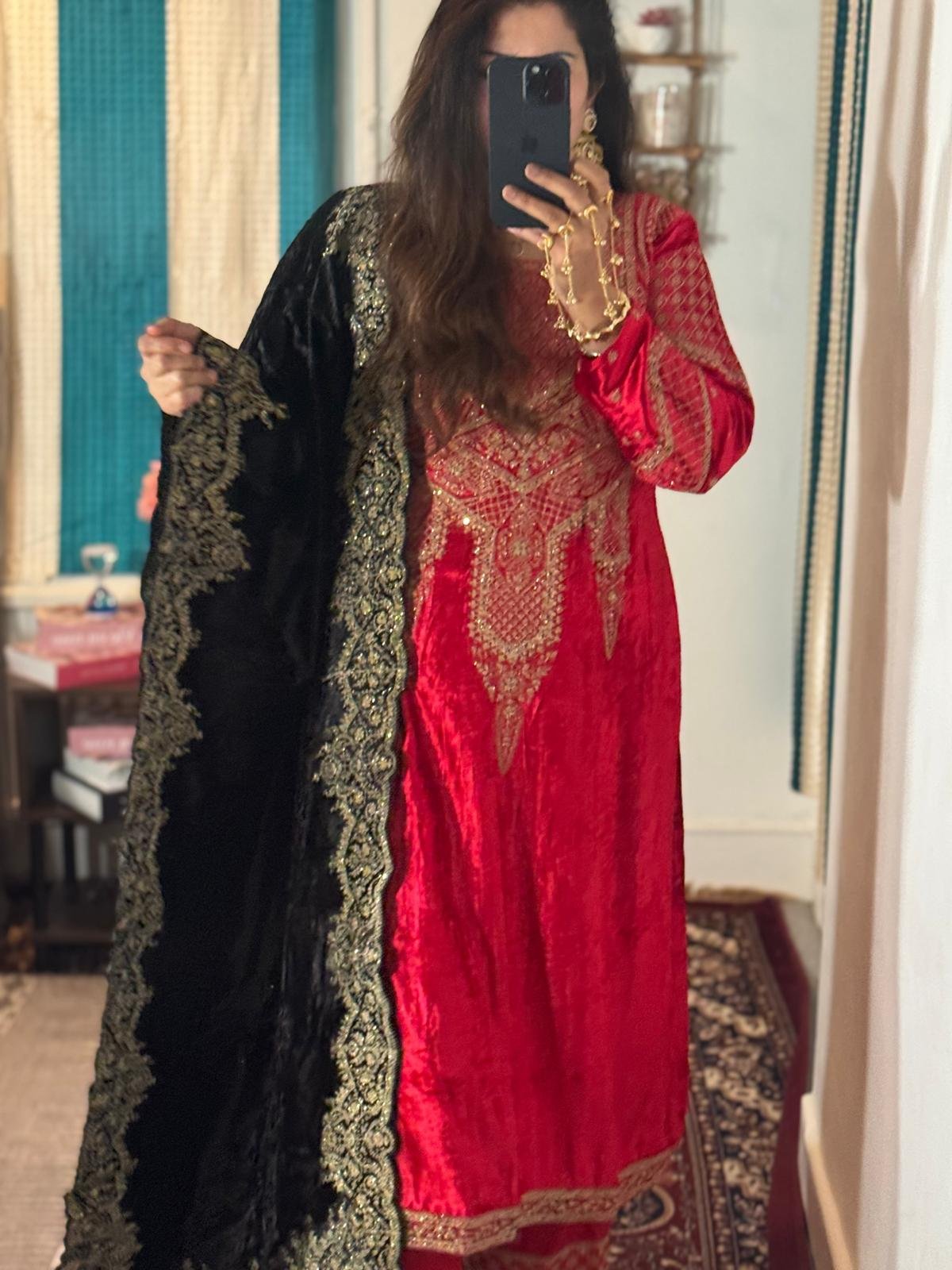 Ever demanding red velvet suit with beautiful intrecate detailing and paired up with contrast black velvet shawl along with embroidered pashmina bottom
